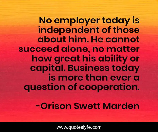 This page presents the quote "No employer today is independent of those about him. He cannot succeed alone, no matter how great his ability or capital. Business today is more than ever a question of cooperation.". Author of this quote is Orison Swett Marden. This quote is about alone, great, today,.