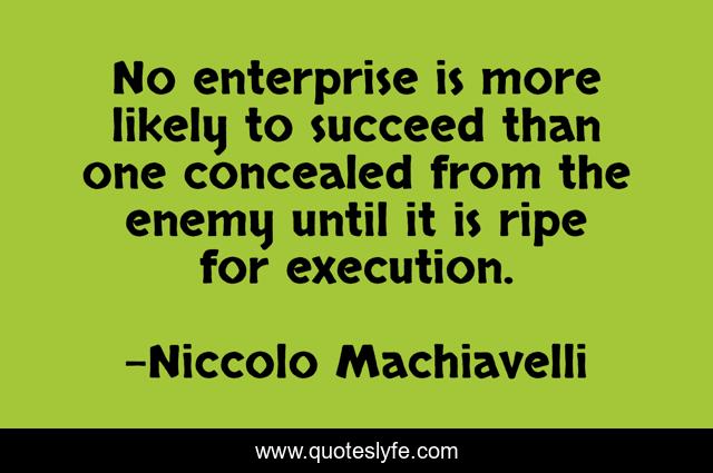 This page presents the quote "No enterprise is more likely to succeed than one concealed from the enemy until it is ripe for execution.". Author of this quote is Niccolo Machiavelli. This quote is about enemy, execution, succeed,.