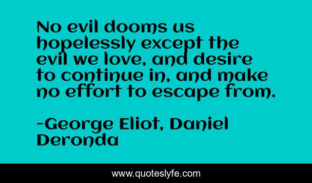 This page presents the quote "No evil dooms us hopelessly except the evil we love, and desire to continue in, and make no effort to escape from.". Author of this quote is George Eliot, Daniel Deronda. This quote is about repentance, sin, evil, temptation,.