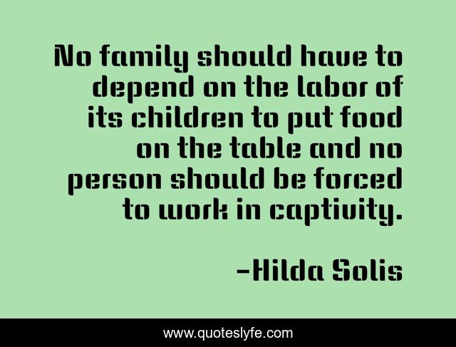 This page presents the quote "No family should have to depend on the labor of its children to put food on the table and no person should be forced to work in captivity.". Author of this quote is Hilda Solis. This quote is about food, work, children,.