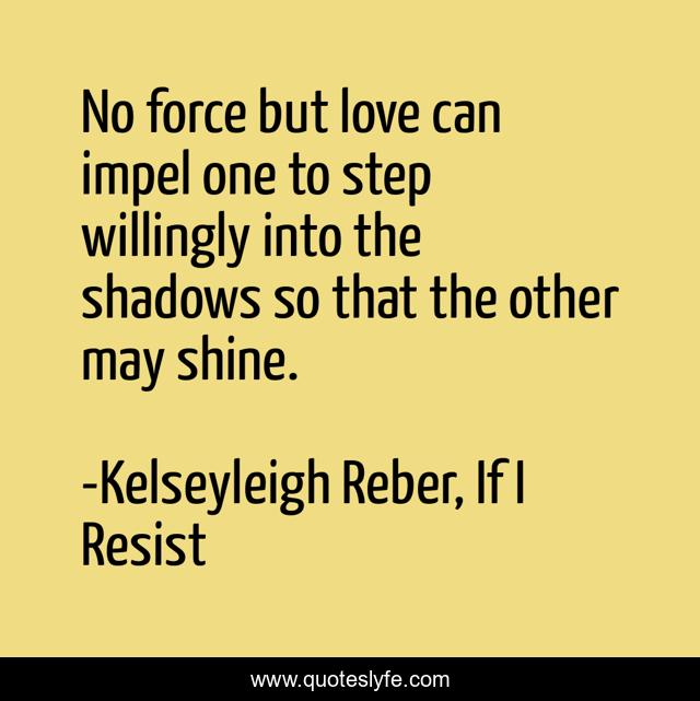 This page presents the quote "No force but love can impel one to step willingly into the shadows so that the other may shine.". Author of this quote is Kelseyleigh Reber, If I Resist. This quote is about true-love, lovers, love, sacrifice, sacrifice-for-others, compromise, affection,.