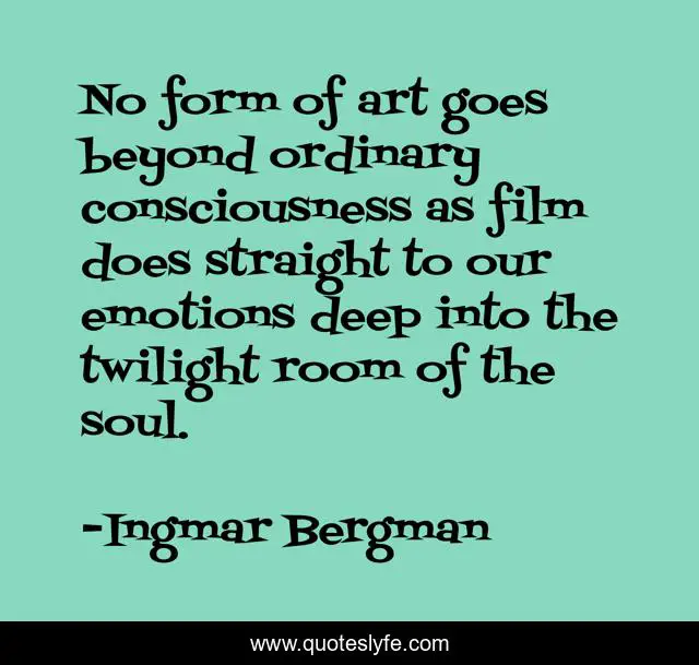 This page presents the quote "No form of art goes beyond ordinary consciousness as film does straight to our emotions deep into the twilight room of the soul.". Author of this quote is Ingmar Bergman. This quote is about acting, theatre,.