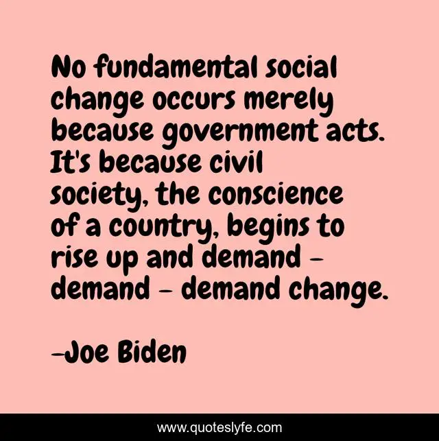 This page presents the quote "No fundamental social change occurs merely because government acts. It's because civil society, the conscience of a country, begins to rise up and demand - demand - demand change.". Author of this quote is Joe Biden. This quote is about conscience, society, change,.