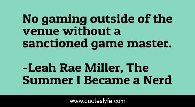 This page presents the quote "No gaming outside of the venue without a sanctioned game master.". Author of this quote is Leah Rae Miller, The Summer I Became a Nerd. This quote is about culture, geeks, geekery, rpg, role-playing-game,.