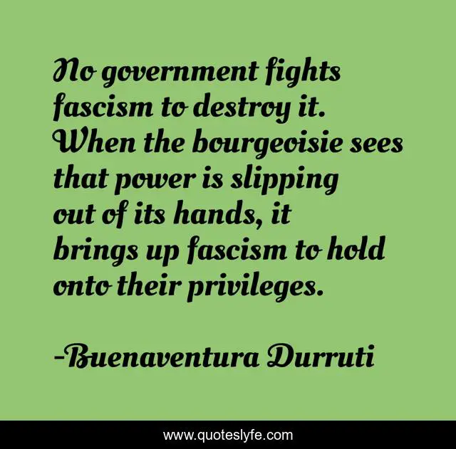 This page presents the quote "No government fights fascism to destroy it. When the bourgeoisie sees that power is slipping out of its hands, it brings up fascism to hold onto their privileges.". Author of this quote is Buenaventura Durruti. This quote is about hold, power, hands,.