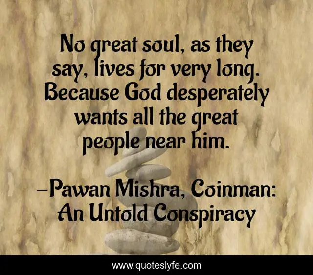 This page presents the quote "No great soul, as they say, lives for very long. Because God desperately wants all the great people near him.". Author of this quote is Pawan Mishra, Coinman: An Untold Conspiracy. This quote is about great, god, soul, great-people, greatness, death-and-dying,.