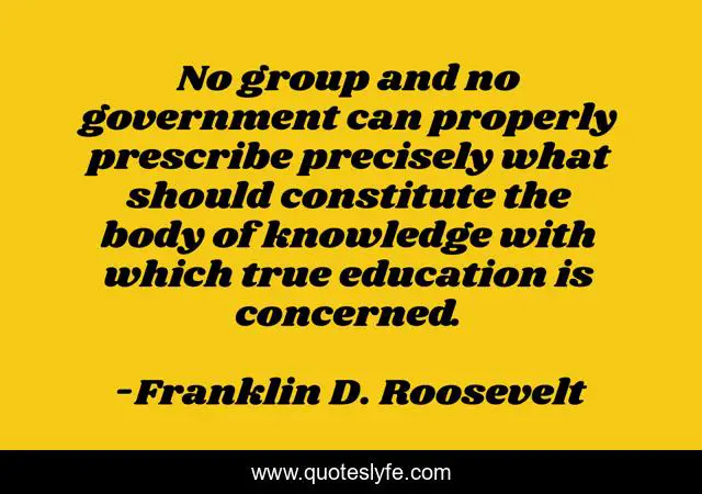 This page presents the quote "No group and no government can properly prescribe precisely what should constitute the body of knowledge with which true education is concerned.". Author of this quote is Franklin D. Roosevelt. This quote is about body, education, government,.