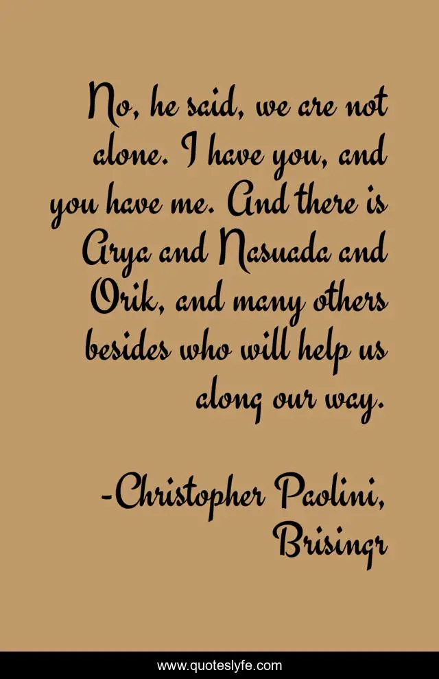 This page presents the quote "No, he said, we are not alone. I have you, and you have me. And there is Arya and Nasuada and Orik, and many others besides who will help us along our way.". Author of this quote is Christopher Paolini, Brisingr. This quote is about alone, friendship, companionship, brisingr,.