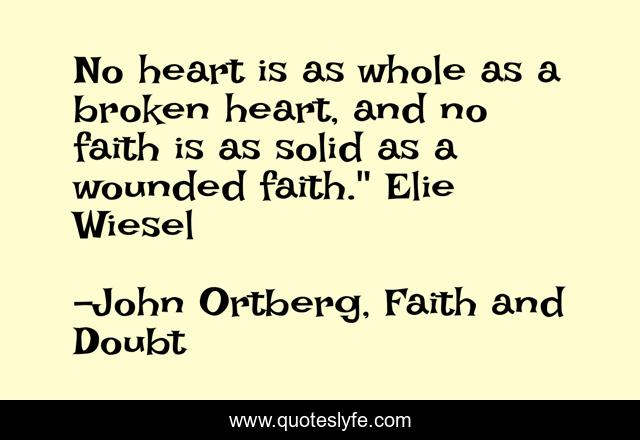This page presents the quote "No heart is as whole as a broken heart, and no faith is as solid as a wounded faith." Elie Wiesel". Author of this quote is John Ortberg, Faith and Doubt. This quote is about maturation, discipleship, intimacy-with-god,.
