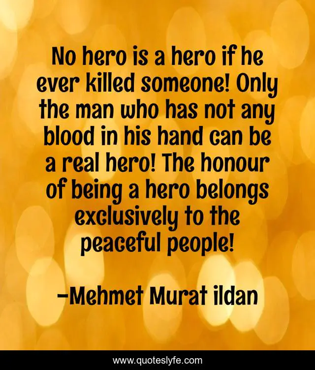 This page presents the quote "No hero is a hero if he ever killed someone! Only the man who has not any blood in his hand can be a real hero! The honour of being a hero belongs exclusively to the peaceful people!". Author of this quote is Mehmet Murat ildan. .