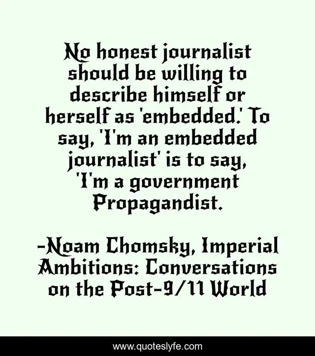 "Noam Chomsky, Imperial Ambitions: Conversations on the Post-9/11 World Quotes." Quoteslyfe.com, 2025. Sat. 06 Dec. 2025. <https://www.quoteslyfe.com/quote/No-honest-journalist-should-be-willing-to-52209>.