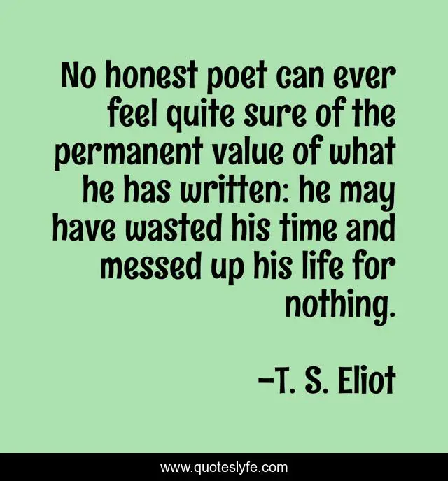 This page presents the quote "No honest poet can ever feel quite sure of the permanent value of what he has written: he may have wasted his time and messed up his life for nothing.". Author of this quote is T. S. Eliot. This quote is about poets, poetry,.