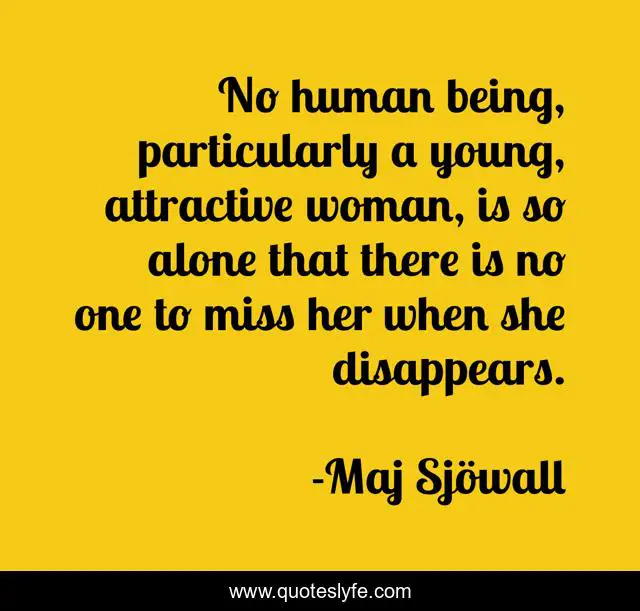 This page presents the quote "No human being, particularly a young, attractive woman, is so alone that there is no one to miss her when she disappears.". Author of this quote is Maj Sjöwall. This quote is about alone, woman,.