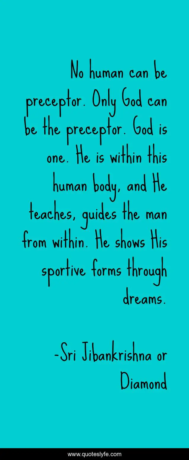 This page presents the quote "No human can be preceptor. Only God can be the preceptor. God is one. He is within this human body, and He teaches, guides the man from within. He shows His sportive forms through dreams.". Author of this quote is Sri Jibankrishna or Diamond. This quote is about god, preceptor, human,.
