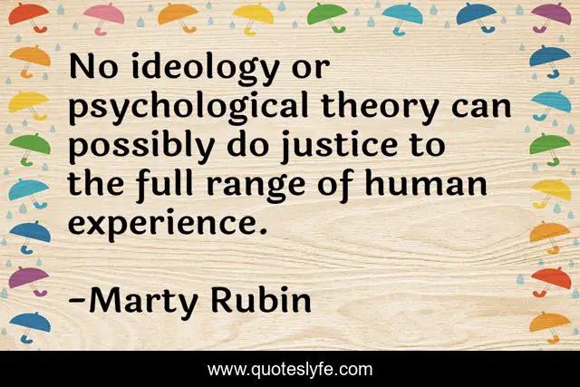 This page presents the quote "No ideology or psychological theory can possibly do justice to the full range of human experience.". Author of this quote is Marty Rubin. This quote is about psychology, philosophy, experience, ideology, truth, humanity,.