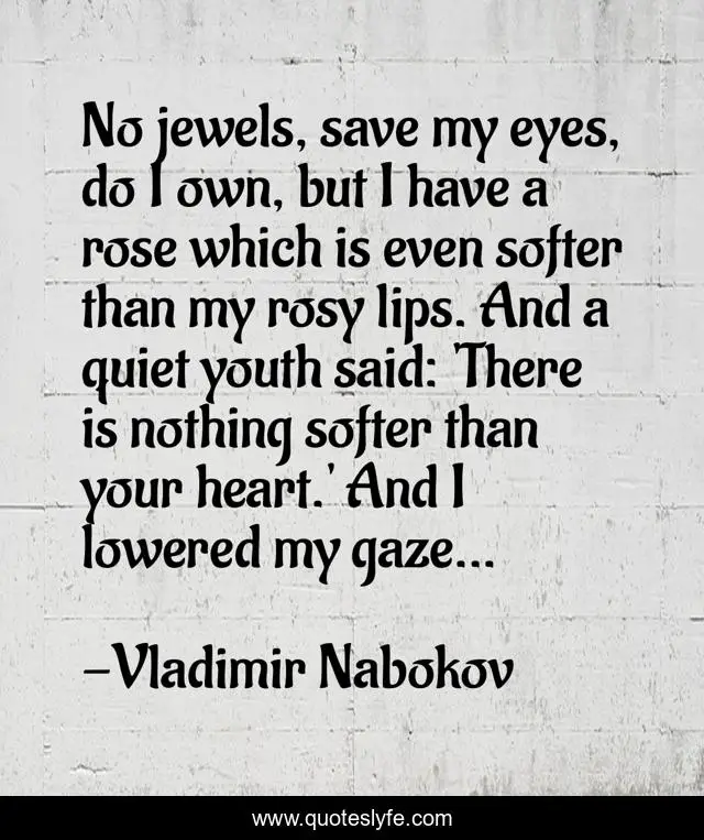 This page presents the quote "No jewels, save my eyes, do I own, but I have a rose which is even softer than my rosy lips. And a quiet youth said: 'There is nothing softer than your heart.' And I lowered my gaze...". Author of this quote is Vladimir Nabokov. This quote is about vulnerability, poetry,.