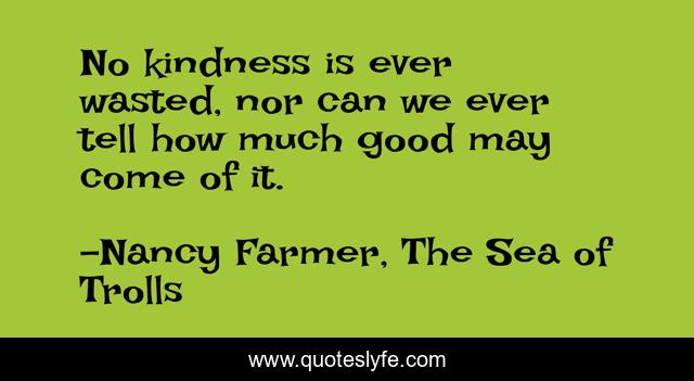 This page presents the quote "No kindness is ever wasted, nor can we ever tell how much good may come of it.". Author of this quote is Nancy Farmer, The Sea of Trolls. This quote is about kindness, wisdom,.