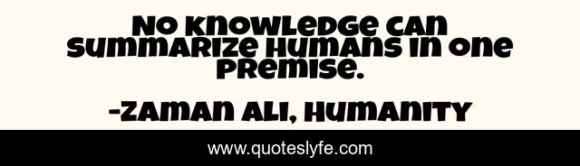 This page presents the quote "No knowledge can summarize humans in one premise.". Author of this quote is Zaman Ali, Humanity. This quote is about summarize, human, knowledge, premise, one,.