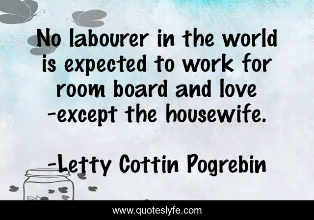 This page presents the quote "No labourer in the world is expected to work for room board and love -except the housewife.". Author of this quote is Letty Cottin Pogrebin. .