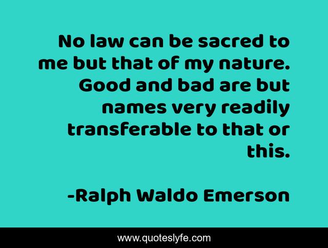 This page presents the quote "No law can be sacred to me but that of my nature. Good and bad are but names very readily transferable to that or this.". Author of this quote is Ralph Waldo Emerson. This quote is about freedom, emerson, values, individuality, morals,.