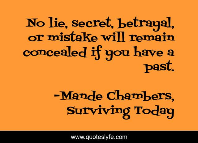 This page presents the quote "No lie, secret, betrayal, or mistake will remain concealed if you have a past.". Author of this quote is Mande Chambers, Surviving Today. This quote is about past, lies, betrayal, secrets,.