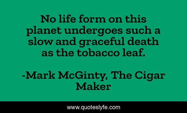 This page presents the quote "No life form on this planet undergoes such a slow and graceful death as the tobacco leaf.". Author of this quote is Mark McGinty, The Cigar Maker. This quote is about cuba-cigar, the-cigar-maker, historical-fiction, ybor-city,.