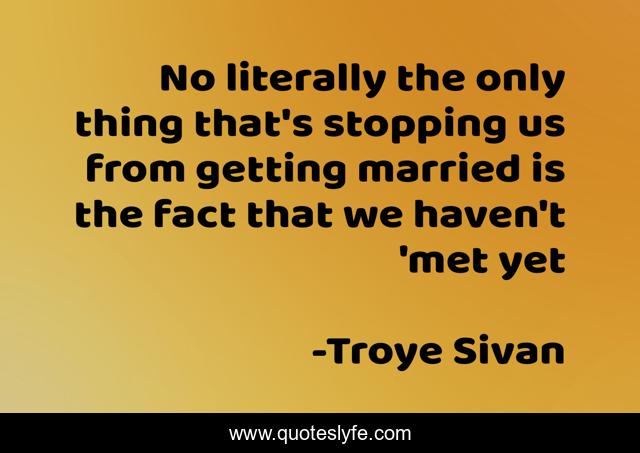 This page presents the quote "No literally the only thing that's stopping us from getting married is the fact that we haven't 'met yet". Author of this quote is Troye Sivan. This quote is about love, married, otp, fact, troyesivan, affection,.