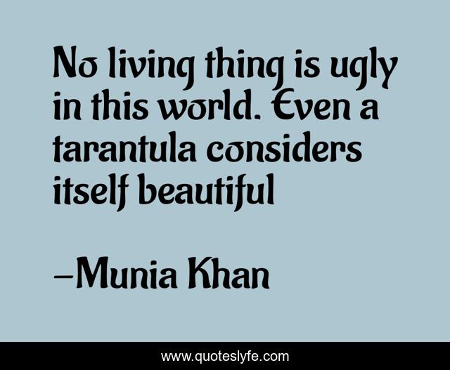 This page presents the quote "No living thing is ugly in this world. Even a tarantula considers itself beautiful". Author of this quote is Munia Khan. This quote is about beautiful, beauty-in-nature, wise-words, beautiful-creatures, consider, beauty, living, insects, philosophy,.