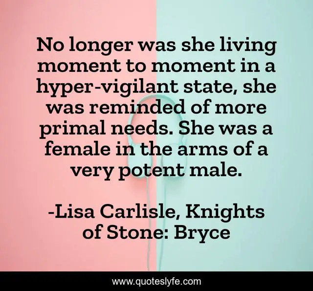 This page presents the quote "No longer was she living moment to moment in a hyper-vigilant state, she was reminded of more primal needs. She was a female in the arms of a very potent male.". Author of this quote is Lisa Carlisle, Knights of Stone: Bryce. This quote is about gargoyle-romance, paranormal-romance,.