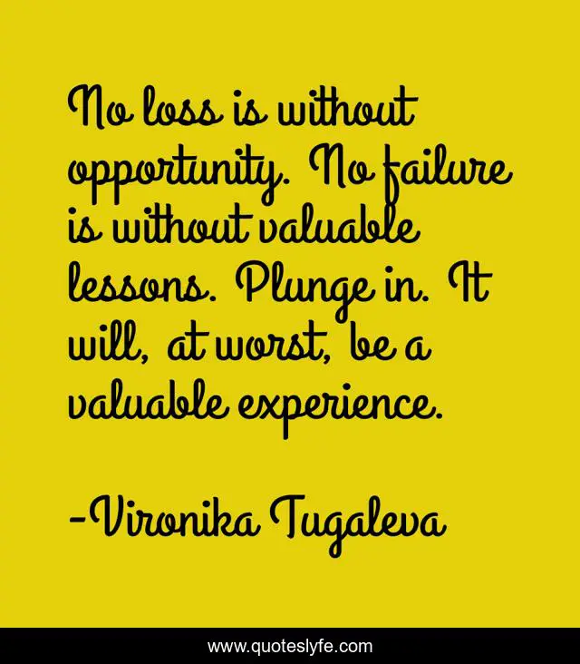 This page presents the quote "No loss is without opportunity. No failure is without valuable lessons. Plunge in. It will, at worst, be a valuable experience.". Author of this quote is Vironika Tugaleva. This quote is about failure, opportunity, experience,.