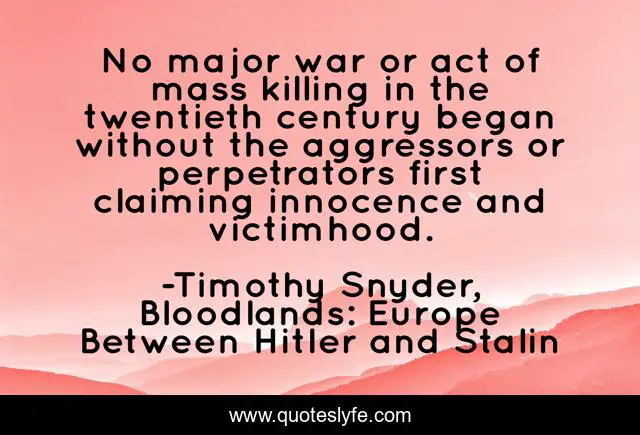 This page presents the quote "No major war or act of mass killing in the twentieth century began without the aggressors or perpetrators first claiming innocence and victimhood.". Author of this quote is Timothy Snyder, Bloodlands: Europe Between Hitler and Stalin. This quote is about world-war-ii, war,.