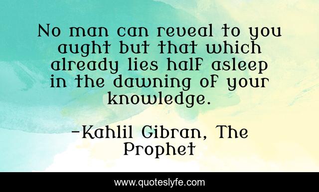 This page presents the quote "No man can reveal to you aught but that which already lies half asleep in the dawning of your knowledge.". Author of this quote is Kahlil Gibran, The Prophet. This quote is about knowledge, poetry,.