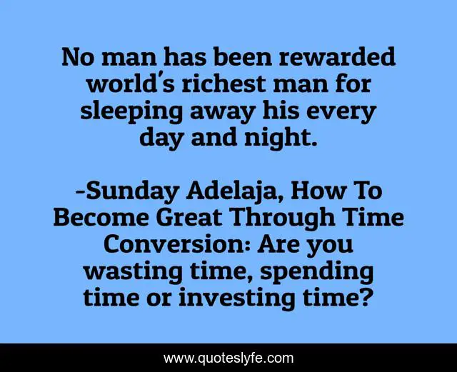 This page presents the quote "No man has been rewarded world's richest man for sleeping away his every day and night.". Author of this quote is Sunday Adelaja, How To Become Great Through Time Conversion: Are you wasting time, spending time or investing time?. This quote is about life, conversion, productivity, wealth, greatness, waste, humanity, product, rewards,.