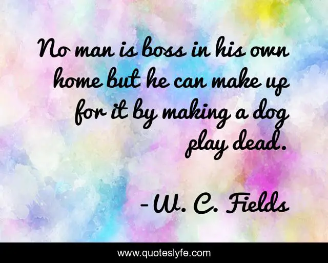 This page presents the quote "No man is boss in his own home but he can make up for it by making a dog play dead.". Author of this quote is W. C. Fields. This quote is about love, marriage, affection,.