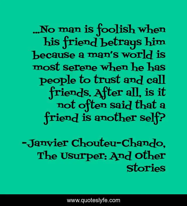 This page presents the quote "...No man is foolish when his friend betrays him because a man’s world is most serene when he has people to trust and call friends. After all, is it not often said that a friend is another self?". Author of this quote is Janvier Chouteu-Chando, The Usurper: And Other Stories. This quote is about love, family, optimistic, confidence, humor, positive, romance, spirituality, enthusiasm,.