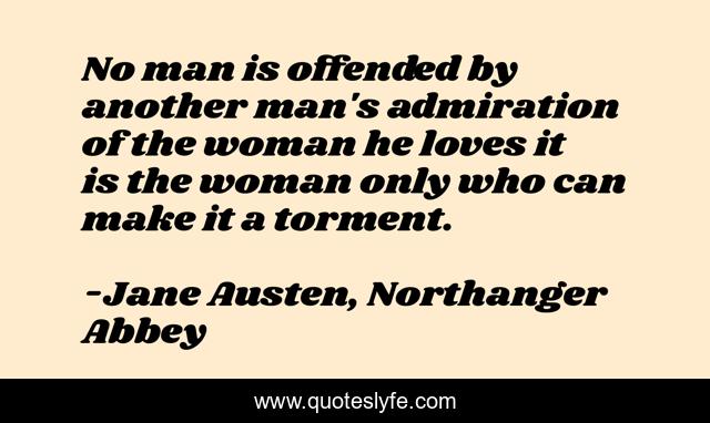 This page presents the quote "No man is offended by another man's admiration of the woman he loves it is the woman only who can make it a torment.". Author of this quote is Jane Austen, Northanger Abbey. This quote is about jane-austen, northanger-abbey, literature, love, affection,.