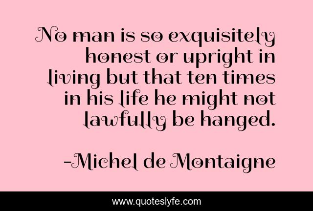 This page presents the quote "No man is so exquisitely honest or upright in living but that ten times in his life he might not lawfully be hanged.". Author of this quote is Michel de Montaigne. This quote is about ethics, morality,.