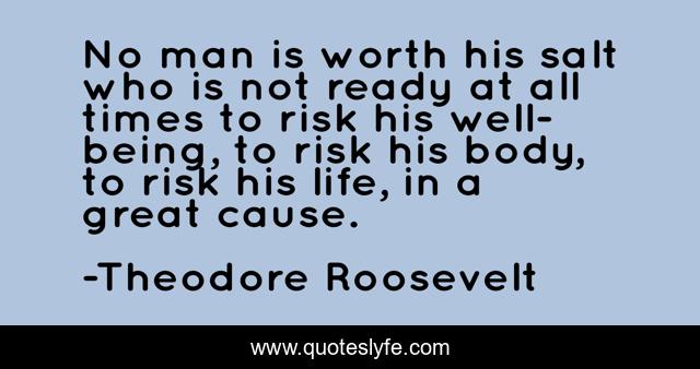 This page presents the quote "No man is worth his salt who is not ready at all times to risk his well-being, to risk his body, to risk his life, in a great cause.". Author of this quote is Theodore Roosevelt. This quote is about life, risk, man,.
