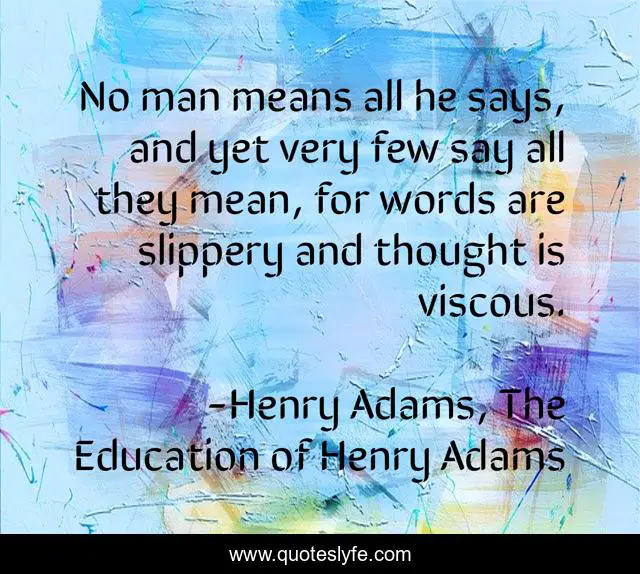 This page presents the quote "No man means all he says, and yet very few say all they mean, for words are slippery and thought is viscous.". Author of this quote is Henry Adams, The Education of Henry Adams. This quote is about integrity, honesty, truth-telling, government,.