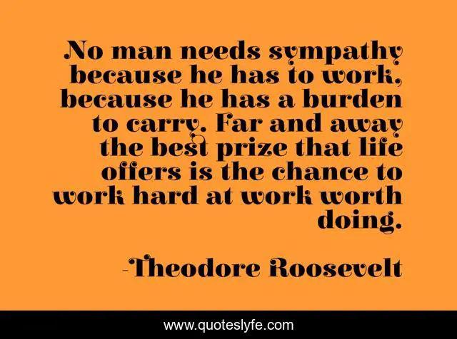 This page presents the quote "No man needs sympathy because he has to work, because he has a burden to carry. Far and away the best prize that life offers is the chance to work hard at work worth doing.". Author of this quote is Theodore Roosevelt. This quote is about work, prize, achievement, labor,.