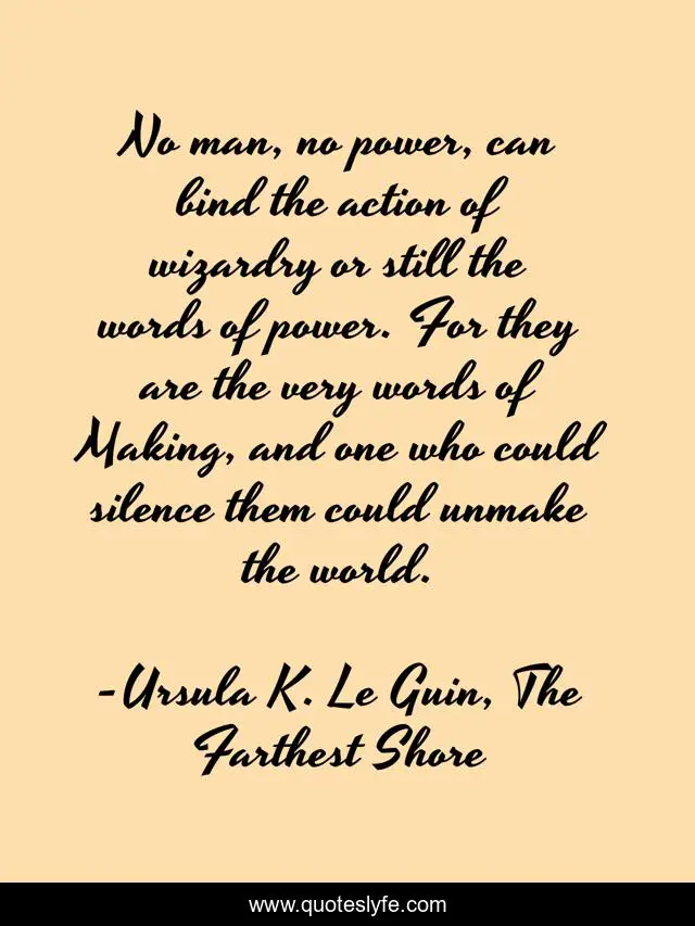This page presents the quote "No man, no power, can bind the action of wizardry or still the words of power. For they are the very words of Making, and one who could silence them could unmake the world.". Author of this quote is Ursula K. Le Guin, The Farthest Shore. This quote is about wizard, magic, names,.