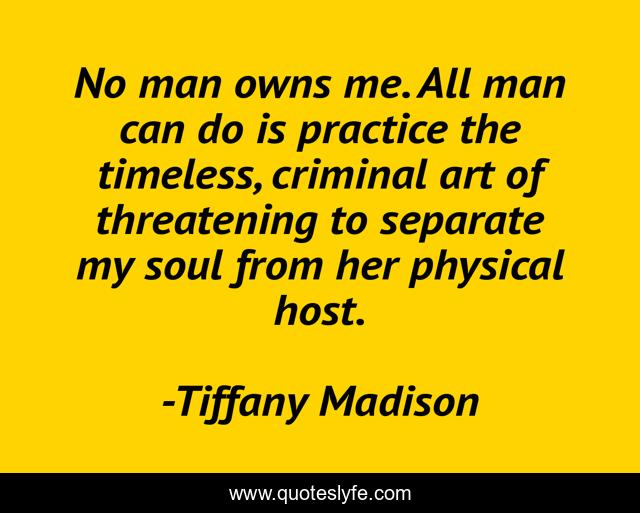This page presents the quote "No man owns me. All man can do is practice the timeless, criminal art of threatening to separate my soul from her physical host.". Author of this quote is Tiffany Madison. This quote is about art, eternal-life, freedom, libertarianism, soul, liberty, freedom-of-thought, freedom-of-speech-dissent, ownership,.