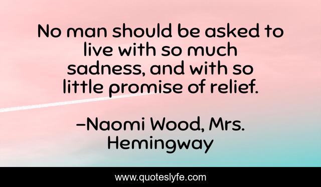 This page presents the quote "No man should be asked to live with so much sadness, and with so little promise of relief.". Author of this quote is Naomi Wood, Mrs. Hemingway. This quote is about 21st-century, hemingway, historical-fiction,.