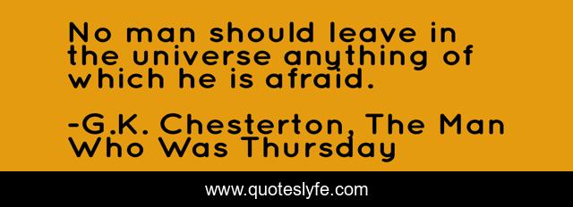 This page presents the quote "No man should leave in the universe anything of which he is afraid.". Author of this quote is G.K. Chesterton, The Man Who Was Thursday. .