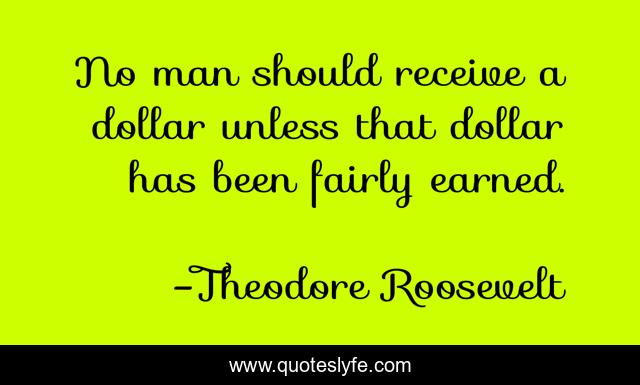 This page presents the quote "No man should receive a dollar unless that dollar has been fairly earned.". Author of this quote is Theodore Roosevelt. This quote is about money, wealth,.
