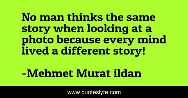 This page presents the quote "No man thinks the same story when looking at a photo because every mind lived a different story!". Author of this quote is Mehmet Murat ildan. This quote is about photographs, story, mehmet-murat-ildan, ildan-wise-sayings, turkish, ildan-wisdom, photography, turkish-playwrights, photography-caption,.