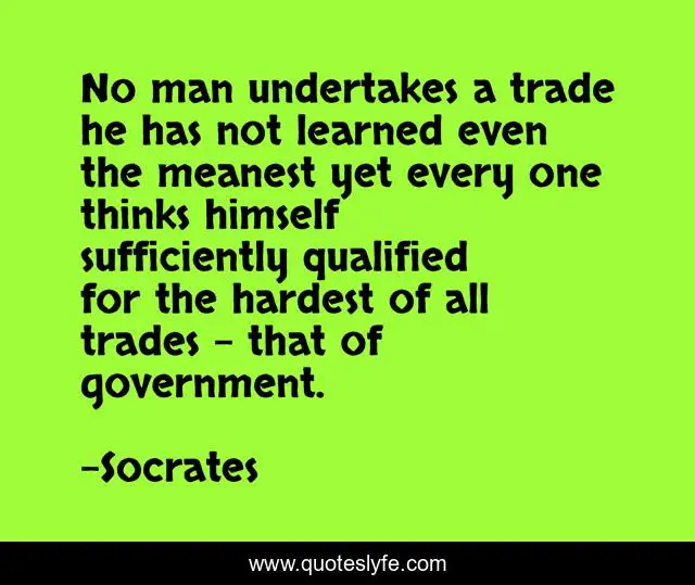 This page presents the quote "No man undertakes a trade he has not learned even the meanest yet every one thinks himself sufficiently qualified for the hardest of all trades - that of government.". Author of this quote is Socrates. .