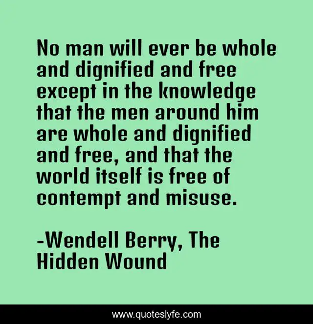This page presents the quote "No man will ever be whole and dignified and free except in the knowledge that the men around him are whole and dignified and free, and that the world itself is free of contempt and misuse.". Author of this quote is Wendell Berry, The Hidden Wound. This quote is about freedom, racism,.