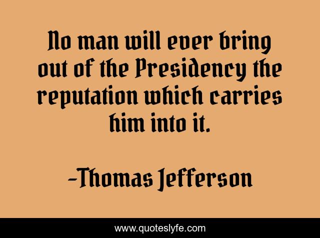 This page presents the quote "No man will ever bring out of the Presidency the reputation which carries him into it.". Author of this quote is Thomas Jefferson. .