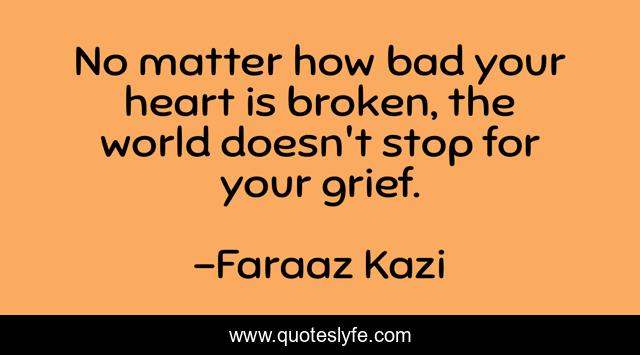 This page presents the quote "No matter how bad your heart is broken, the world doesn't stop for your grief.". Author of this quote is Faraaz Kazi. This quote is about grief, heart, heartbreak, love, affection,.